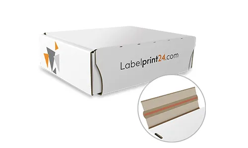 Lepicí uzávěry činí z této skládací lepenky bezpečně uzavíratelnou možnost přepravy. Lze ji snadno znovu otevřít pomocí trhací pásky. Druhý lepicí proužek nabízí možnost stejně bezpečného uzavření krabice i poté, například při vrácení.